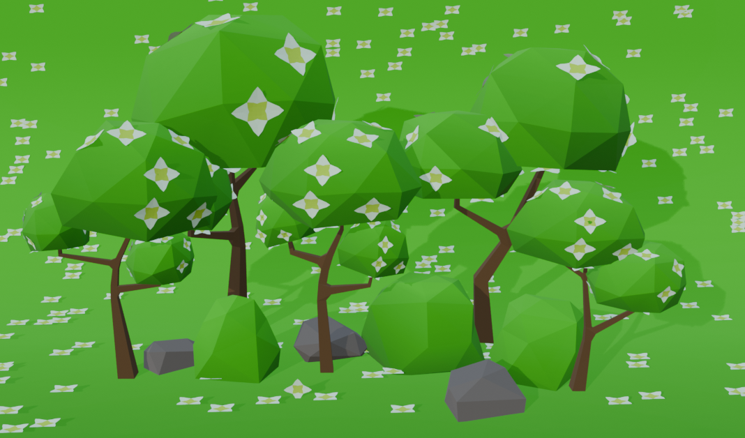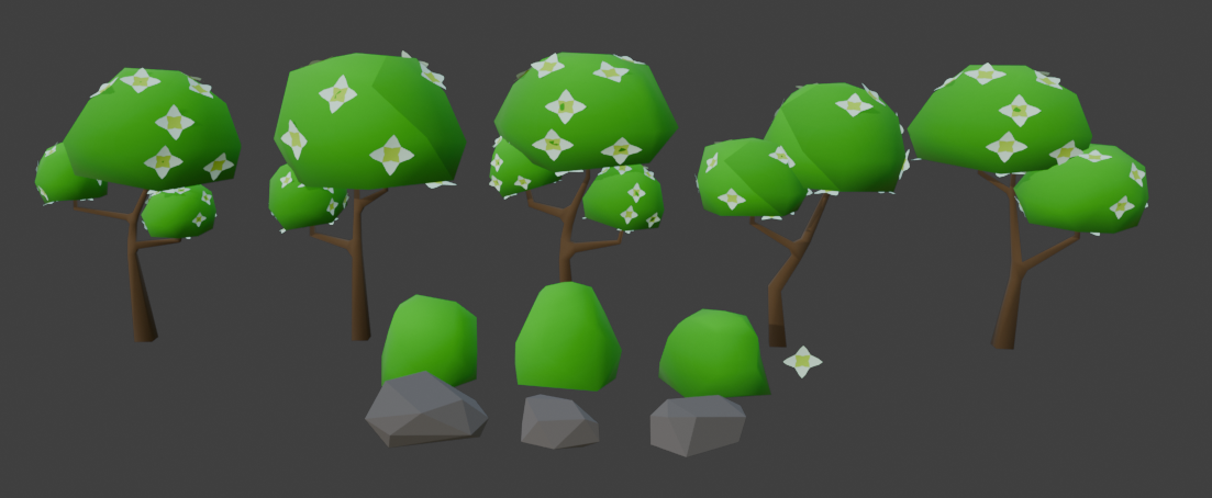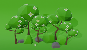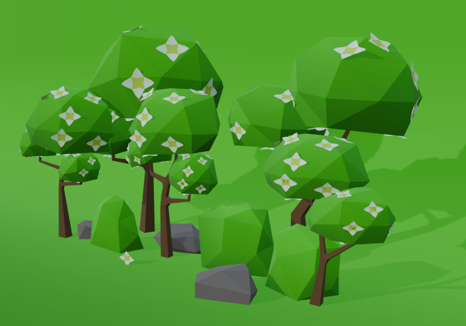 A set of low-poly Flower Forest trees, rocks, and bushes with one material and an atlas.Technical details: